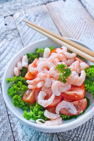 Салат из томатов с креветками в плошке, китайские палочки