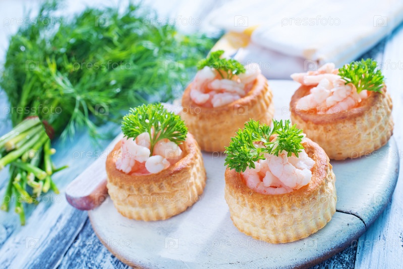 Тарталетки с креветками на голубой подставке