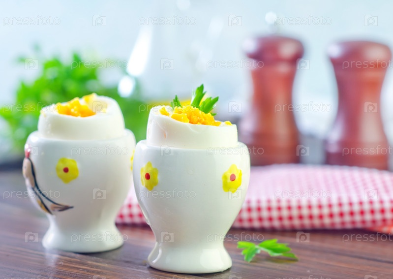 Сваренные яйца в подставках на фоне стола