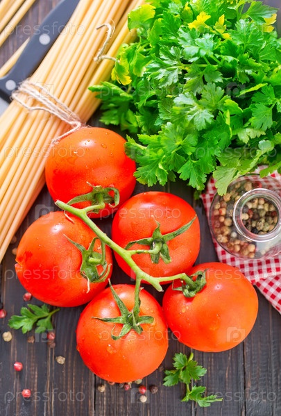 Помидоры, петрушка и спагетти на столе