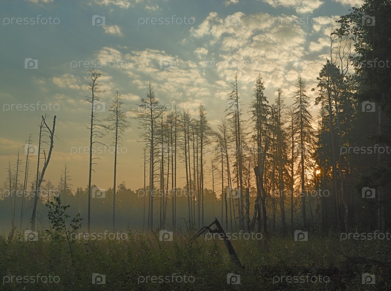 Туман в лесу рано утром