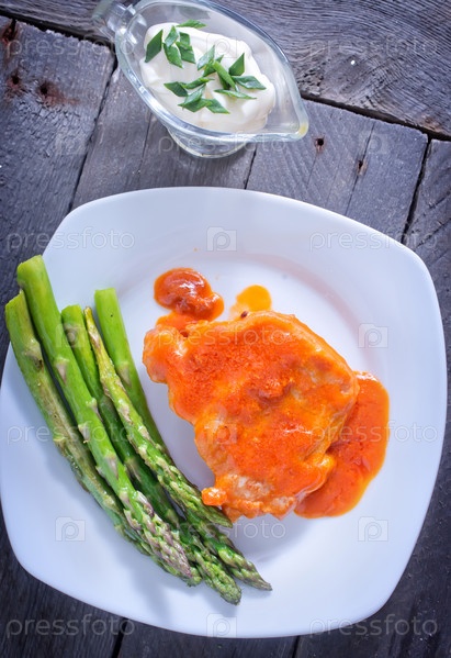 Жареное мясо под соусом со спаржей