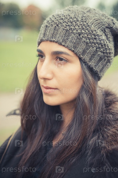 Брюнетка в шапке с пронзительным взглядом вдаль