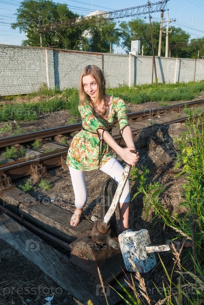 Красивая девушка перемещает железнодорожную стрелку