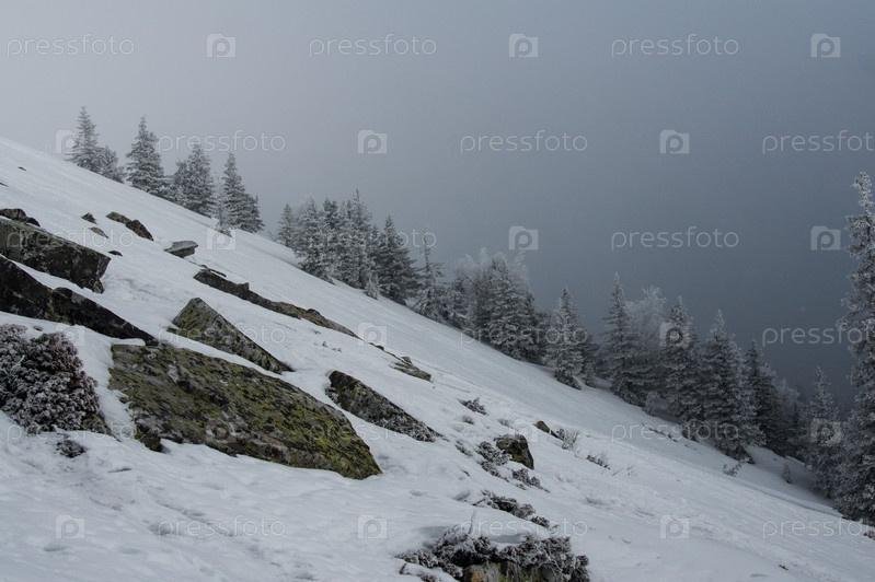 Заснеженный лес на склоне горы