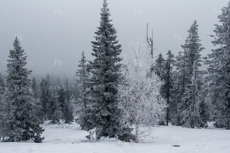 Заснеженный лес на склоне горы