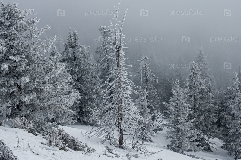 заснеженный лес на склонах горы
