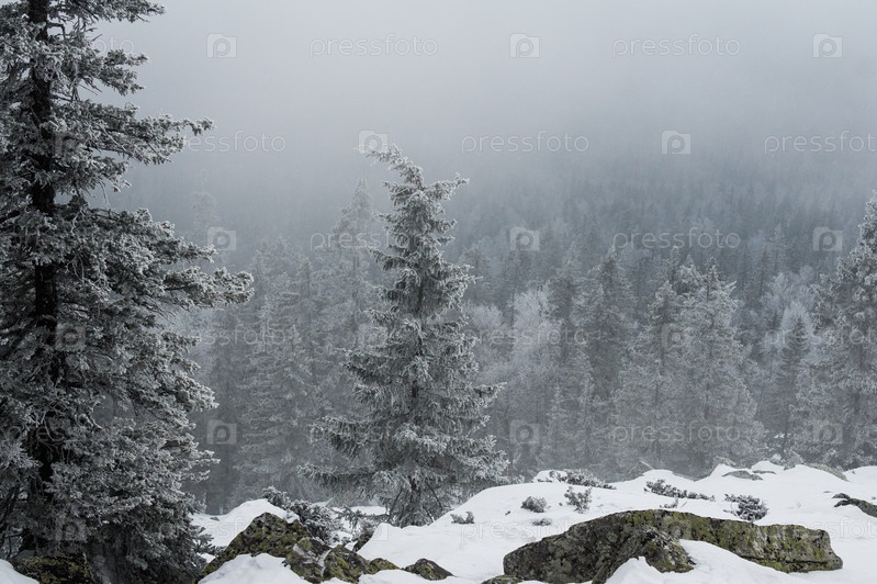 заснеженный лес на склонах горы