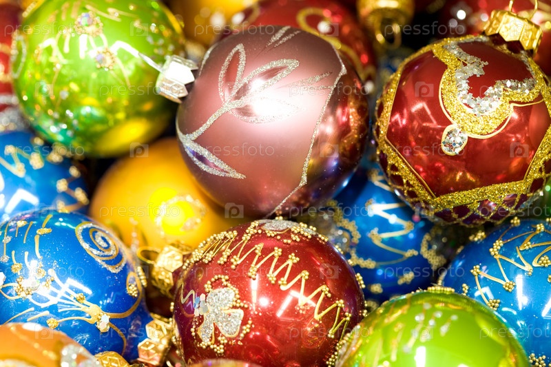 Близкий план красочных круглых игрушечных шаров, украшенных различными искрами