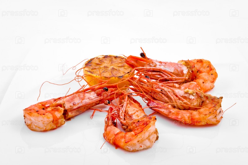 Креветки с лимоном на белом фоне