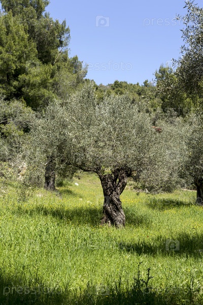 Старые оливковые деревья растут в горах весной