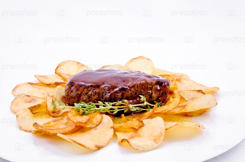 Мясо и чипсы на белом фоне