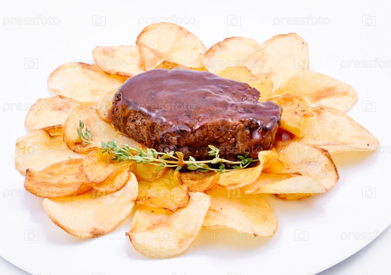 Мясо и чипсы на белом фоне