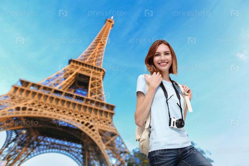 Турист с фотоаппаратом на фоне Эйфелевой башни