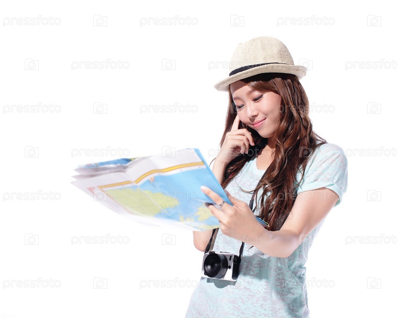 Девушка турист с фотоаппаратом и картой