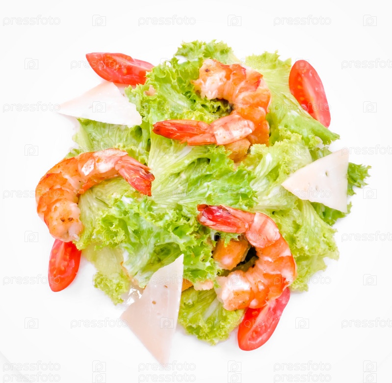 Салат с креветками и сыром на белом фоне