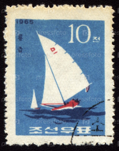 Почтовая марка КНДР 1965 года с яхтой в море