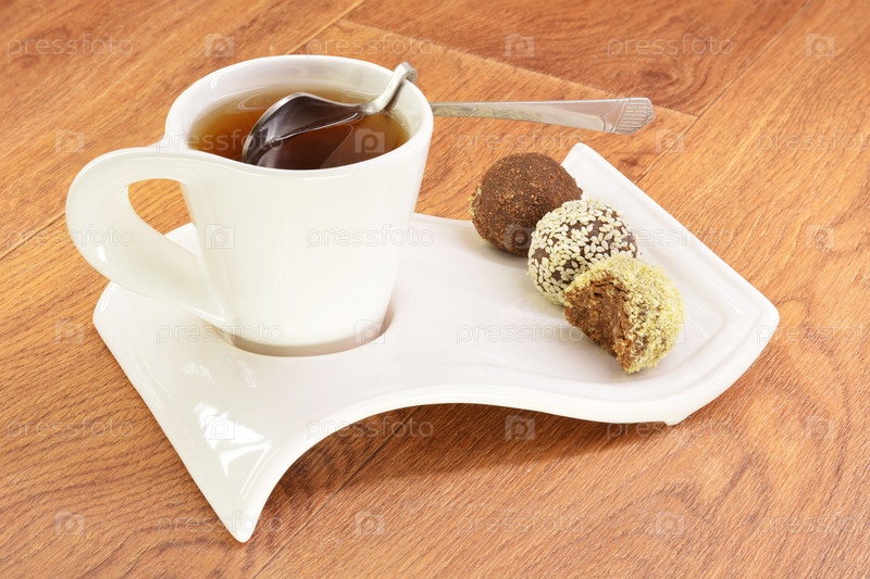 Чай черный в белый кружку и торт