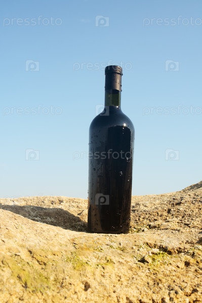Бутылка с вином стоит на скале на фоне неба
