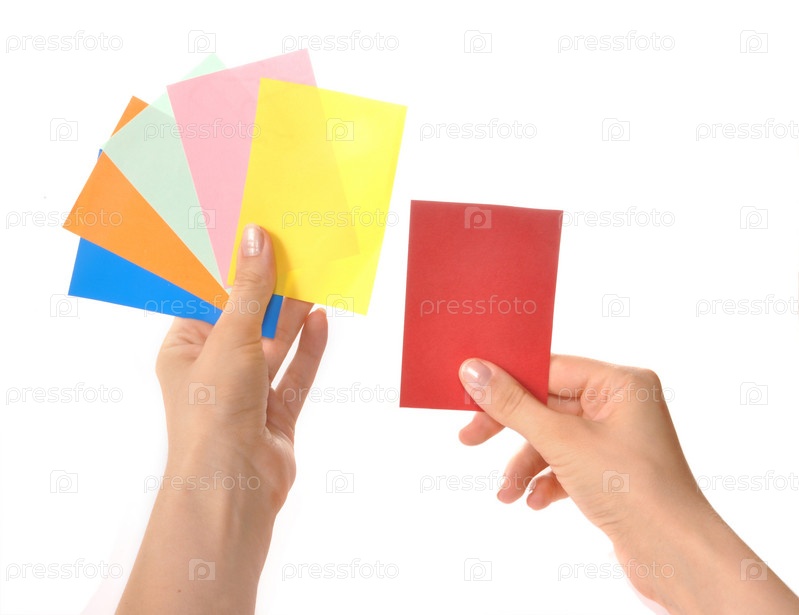 Пустые разноцветные карточки в женских руках, изолированные на белом фоне