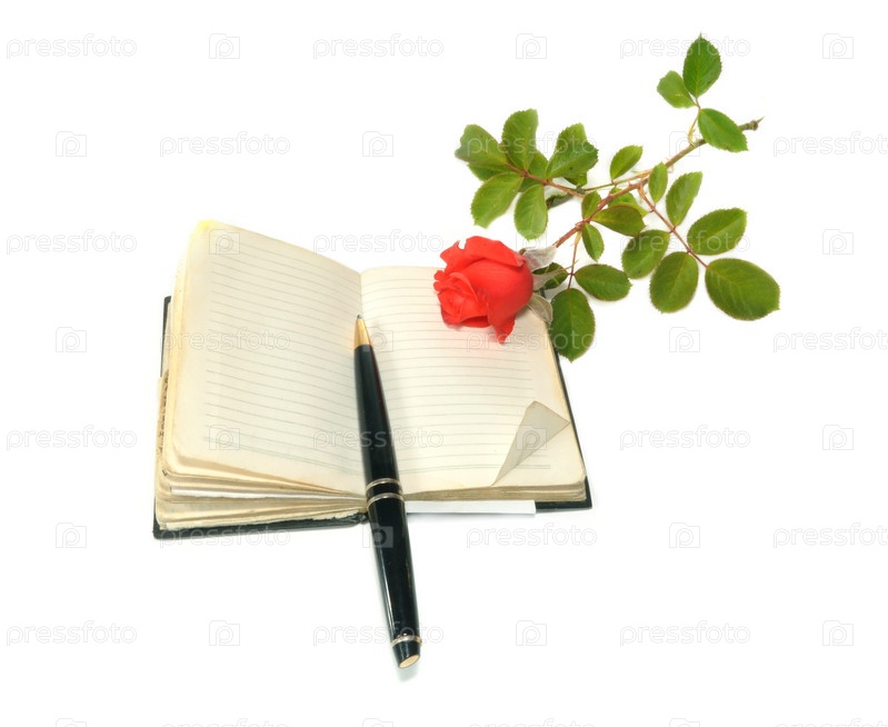 Блокнот, ручка и красная роза, изолированные на белом фоне