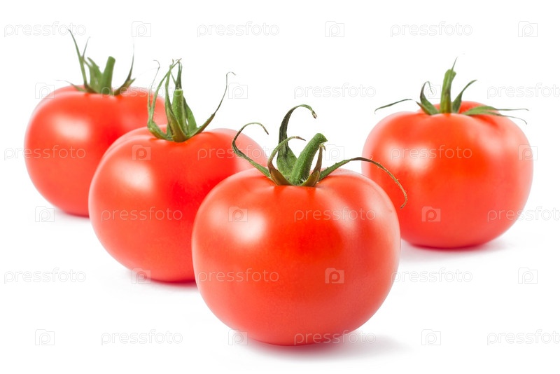 Четыре спелых помидора на белом фоне