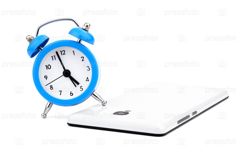 Будильник и белый смартфон, изолированные на белом фоне