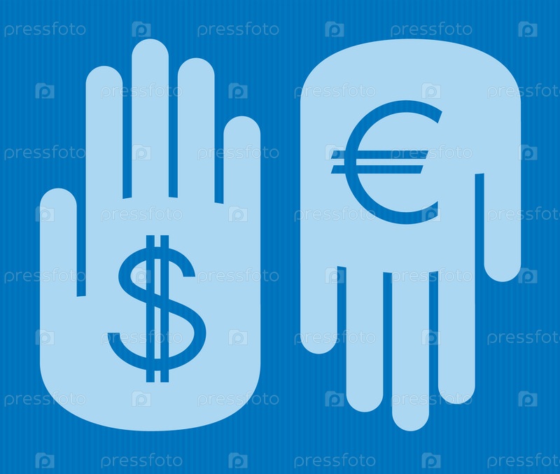Рука с долларом направлена вверх, рука с евро наплавлена вниз на синем фоне. Обмен иностранной валютой "доллар за евро"
