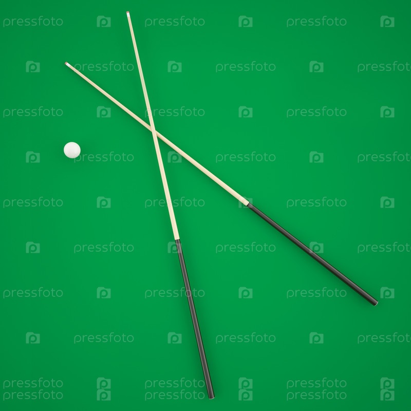 Бильярдный шар и кии на зеленом сукне