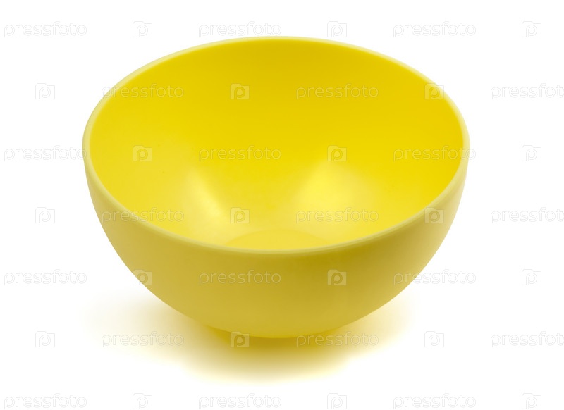 Желтая пустая пластиковая миска, изолирована на белом фоне