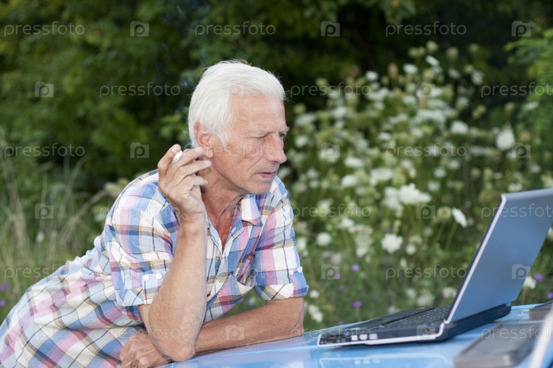 Пожилой мужчина с ноутбуком, сидящий за столом