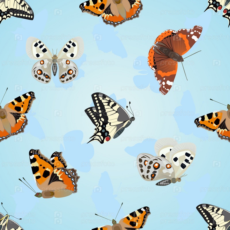 Разноцветные бабочки на голубом фоне