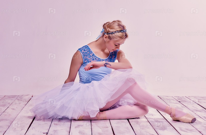Уставшая балерина сидит на деревянном полу