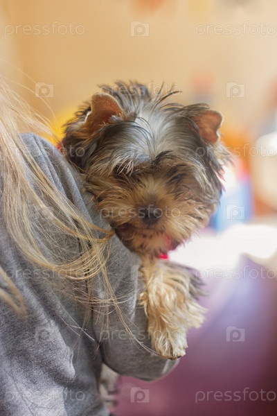 Девочка держит щенка йоркширского терьера
