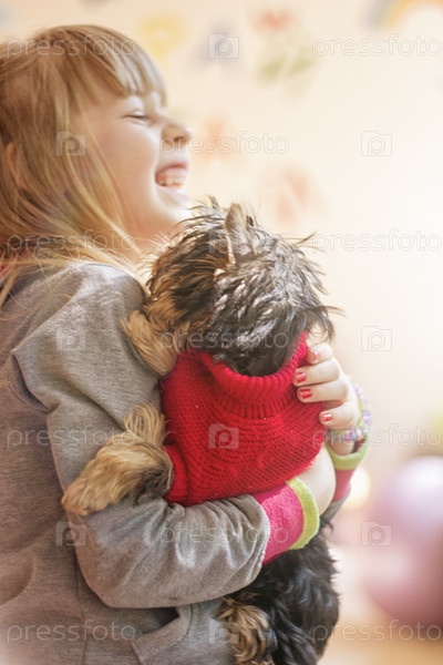 Девочка держит щенка йоркширского терьера