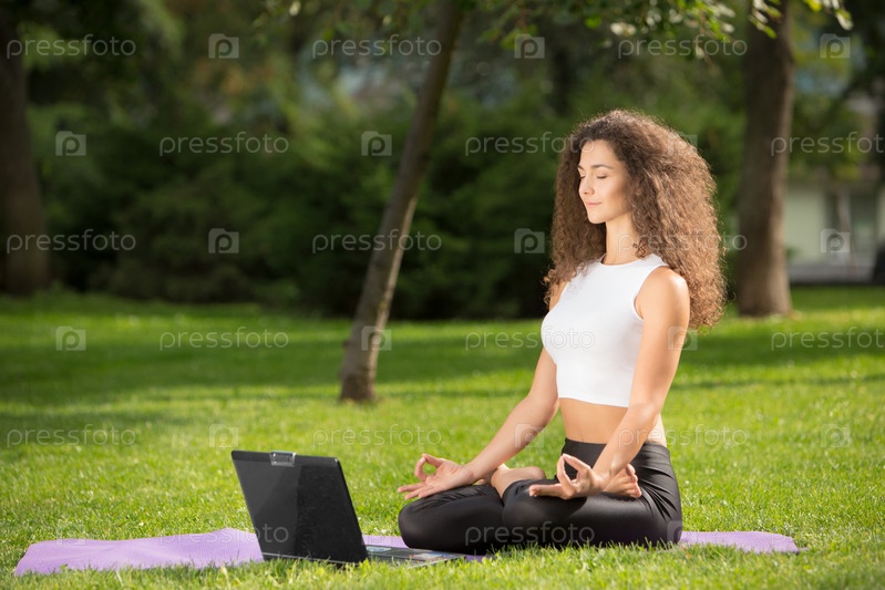 Медитирующая женщина с ноутбуком