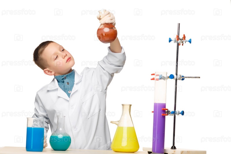 Мальчик проводит химический эксперимент в лаборатории