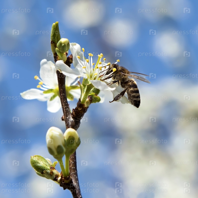 Пчела опыляет цветок вишни
