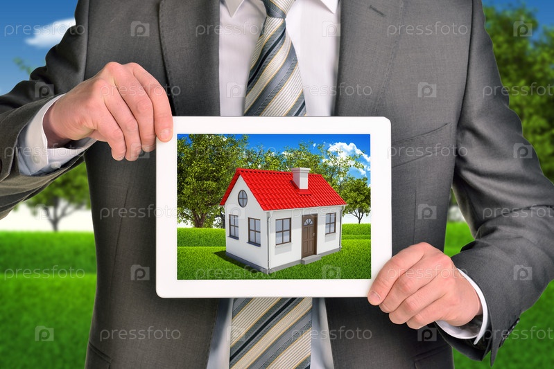 Бизнесмен держит планшет с изображением дома