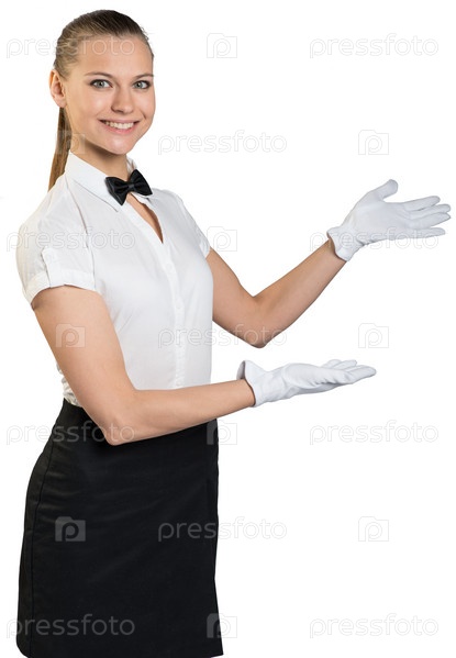 Улыбающаяся официантка стоит в профиль