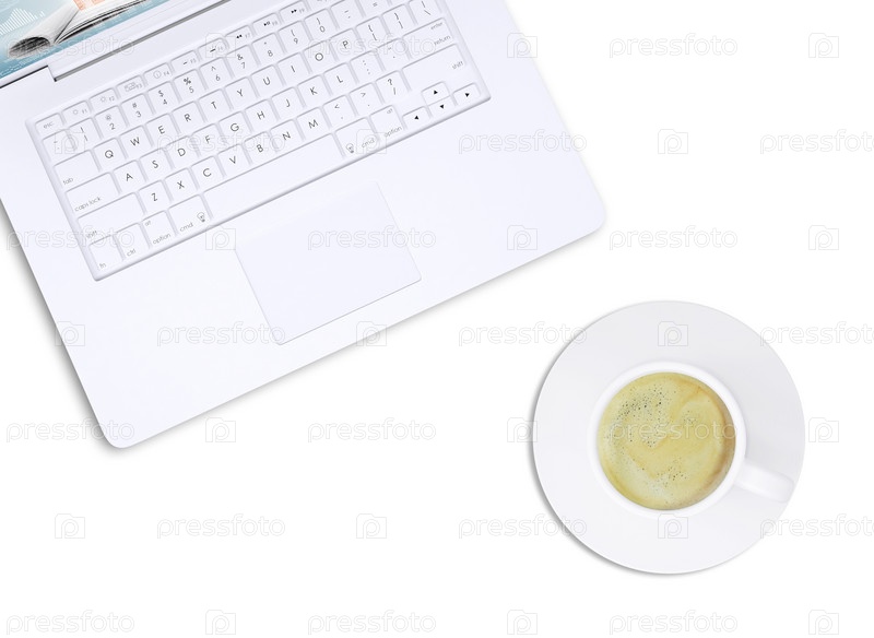 Белый ноутбук и чашка кофе, вид сверху