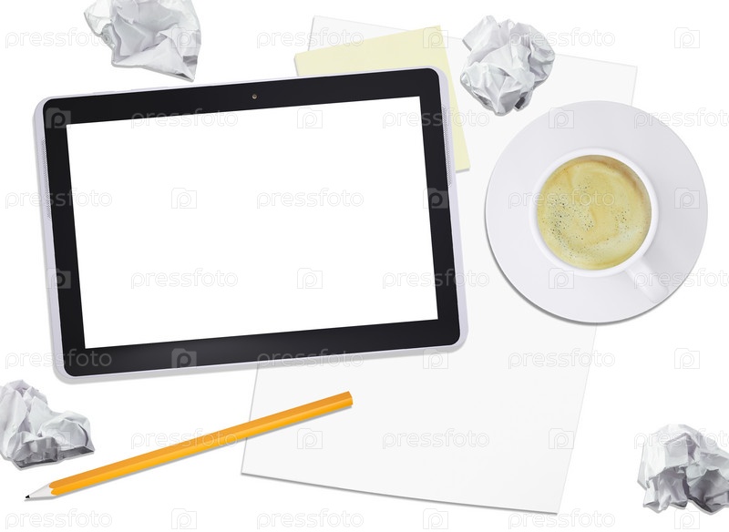 Черный планшет и чашка кофе с карандашом, вид сверху