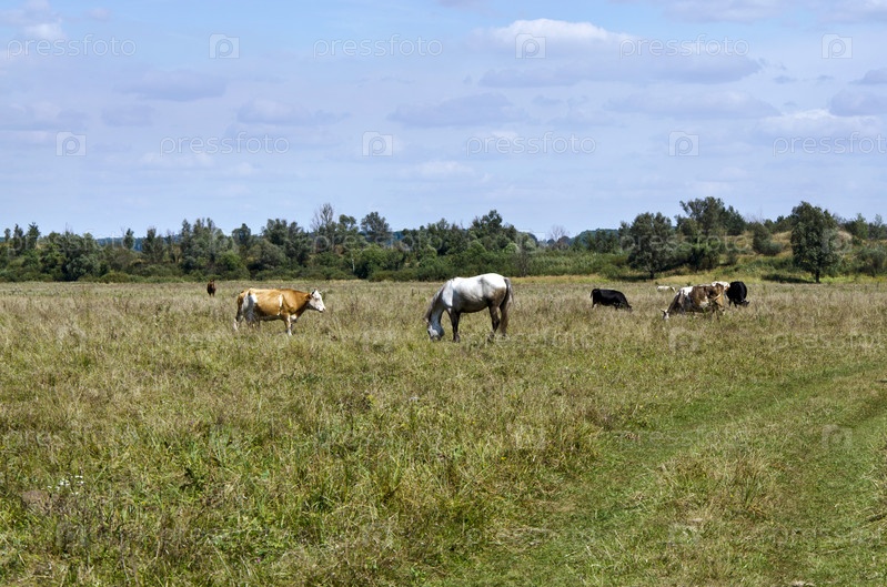 Сельский пейзаж с коровами и лошадьми
