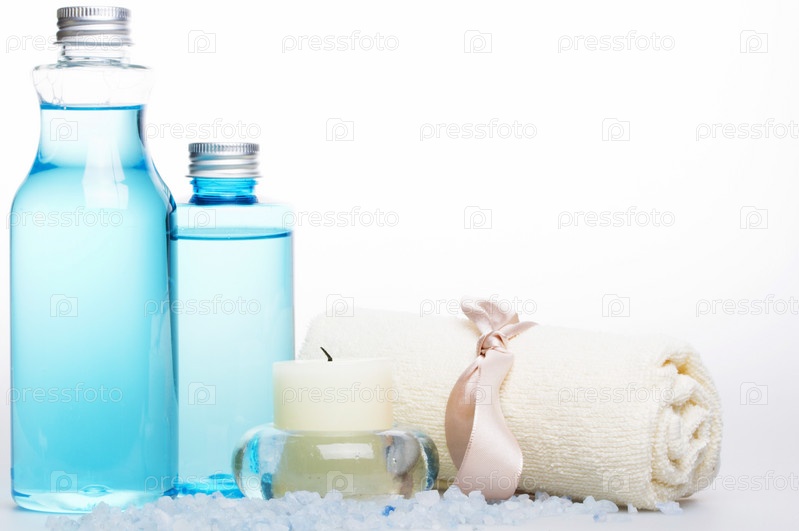 Полотенце, соль для ванн, свеча, жидкое мыло и шампунь на белом фоне