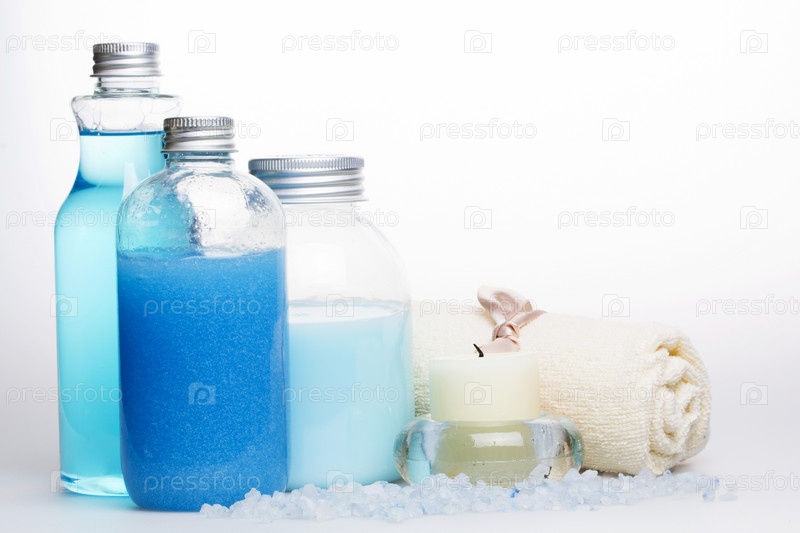 Средства по уходу за телом, полотенце, соль для ванн и свеча на белом фоне