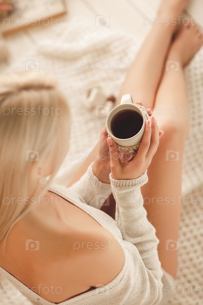 Женщина пьет кофе в постели