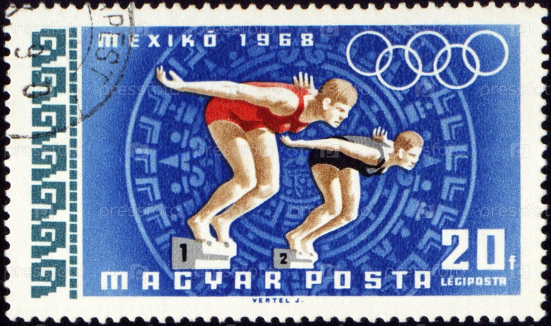 Почтовая марка Венгрии 1968 года, плавание, олимпийские игры в Мехико