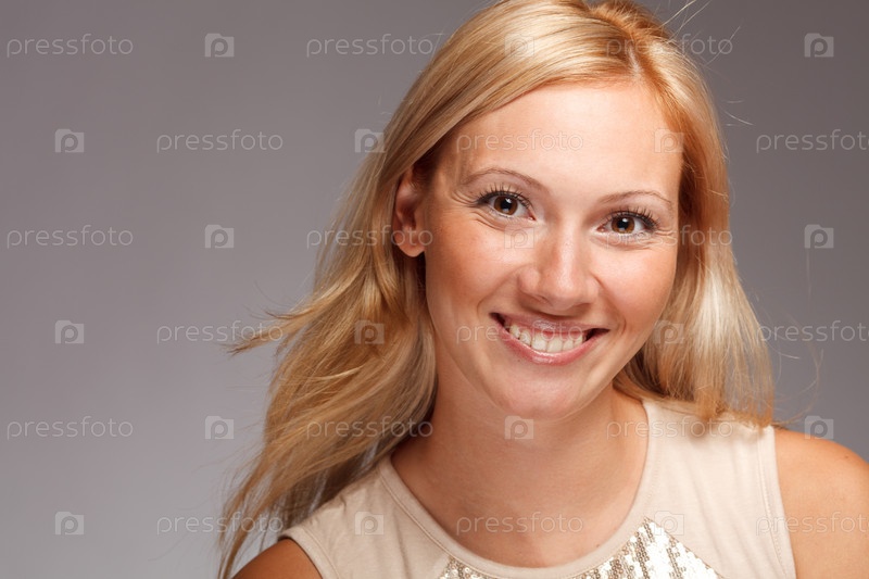 Портрет красивой девушки с великолепной улыбкой на сером фоне