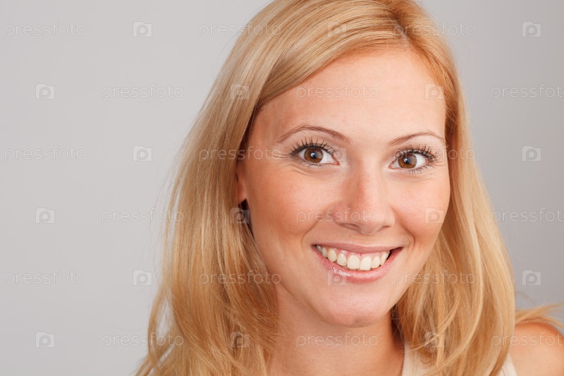 Портрет красивой девушки с великолепной улыбкой на сером фоне