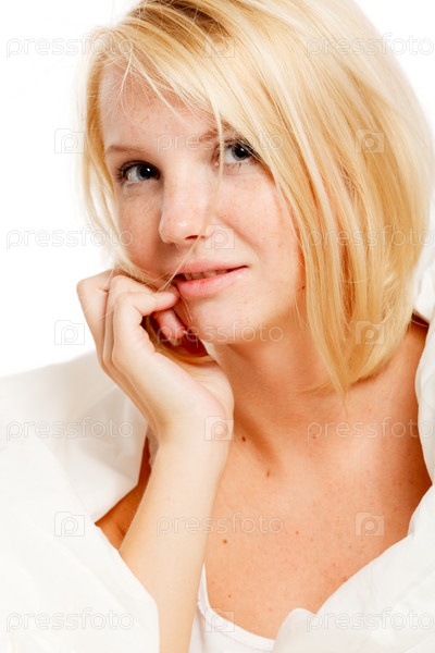 Портрет красивой девушки со светлыми волосами на белом фоне